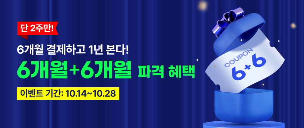 10월 28일까지만 6+6 혜택으로 6개월 가격으로 1년을 이용할 수 있는 파격이벤트까쥐 !!!!!!