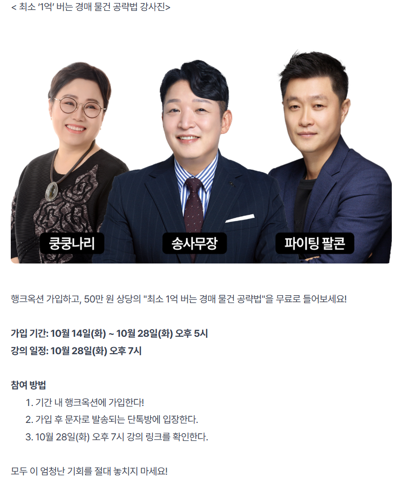 그리고 제일 꿀팁은 행크옥션 가입만해도 최소 1억버는 경매 물건 공략법 라이브 특강을