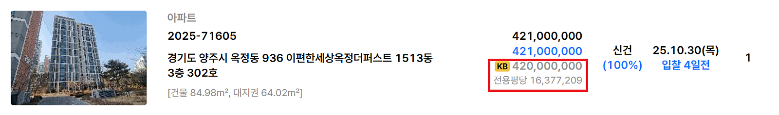 검색 목록에 바로 KB시세와 전용 평당가격이 떠 있어서