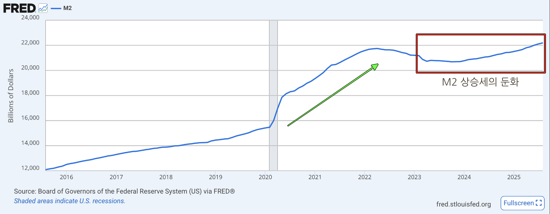 현재 M2 증가율은 완만한 정체 구간에 머물러 있고,