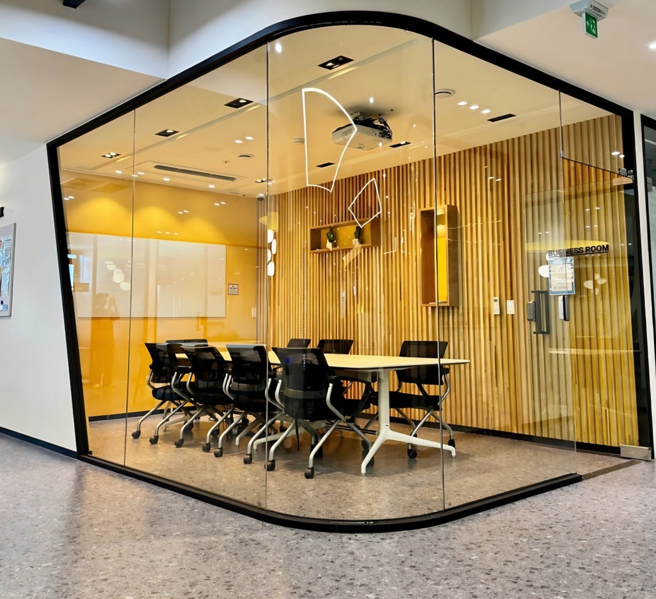 칠판과 빔프로젝트를 활용할 수 있는 큰 회의실을 2곳과 작은 회의실 2곳을 만들었습니다.