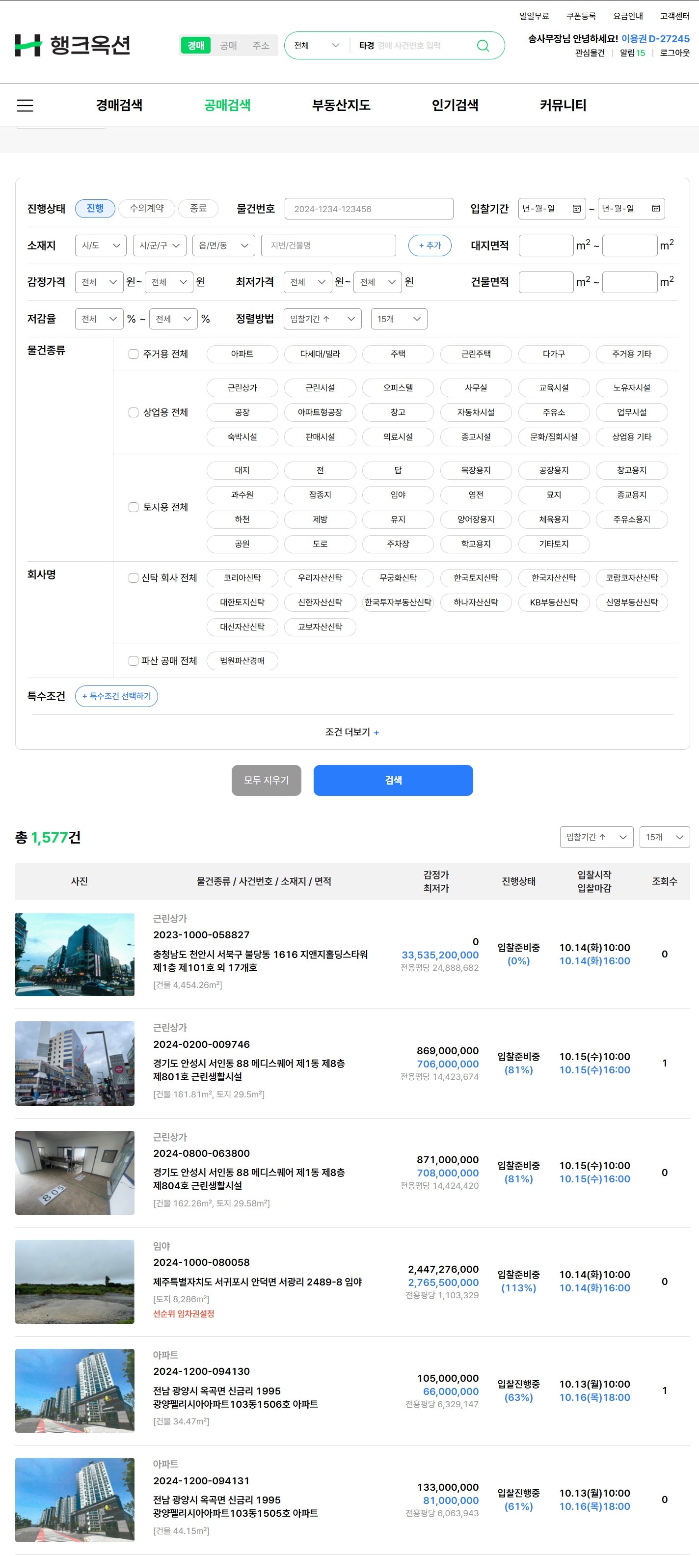 행크옥션에서 신탁공매 물건을 한 번에 검색할 수 있도록 하였습니다.