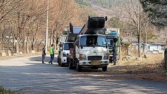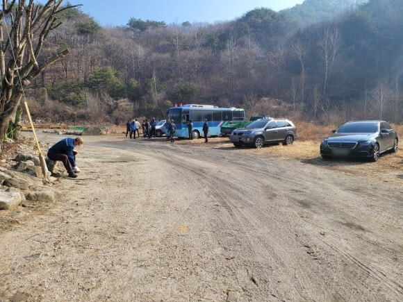 입구에서 기다리고 있으니 노무 인원을 태운 버스와 장비들이 하나씩 도착합니다.