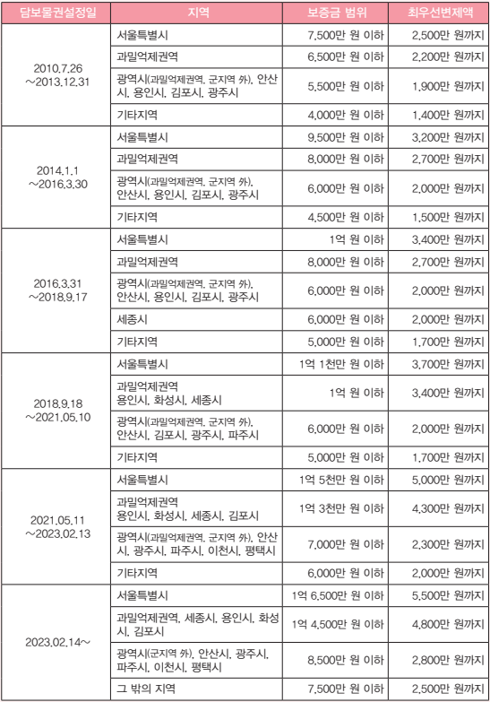 소액임차인의 범위와 최우선변제금액은 아래와 같습니다.