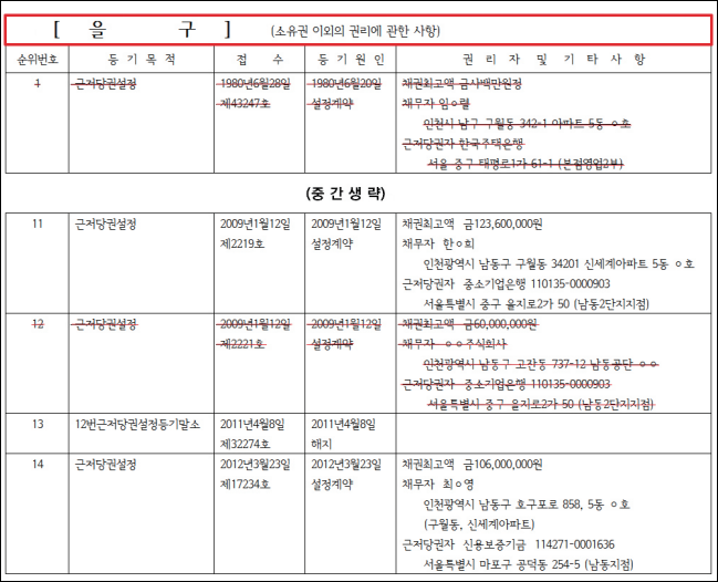 등기부등본 갑구와 을구에 적혀 있는 사항을 빠른 날짜순으로 적어봅니다.