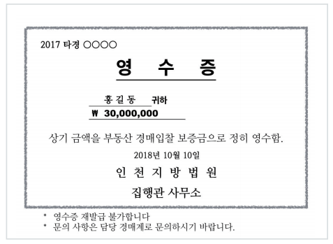 그러면 아래와 같은 입찰 보증금 영수증을 줍니다. 이것은 최고가 매수신고인이 되었다는 증표입니다.