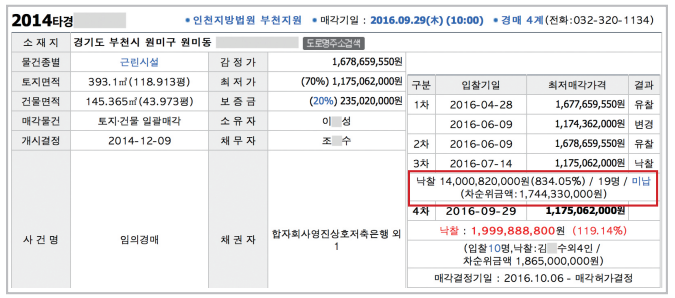 감정가가 약 16억 8000만 원인 이 사건의 3차 매각 결과, 낙찰가는 140억 원이고 2등은 17억 원입니다.