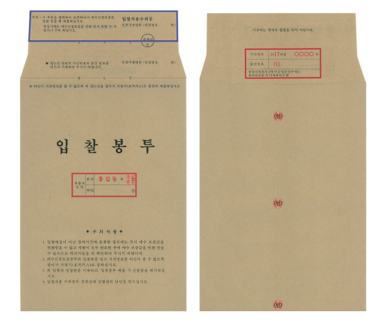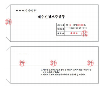 입찰표를 작성하면 입찰보증금을 담은 매수신청보증봉투와 함께 큰 입찰봉투에 함께 넣어 제출하면 됩니다.