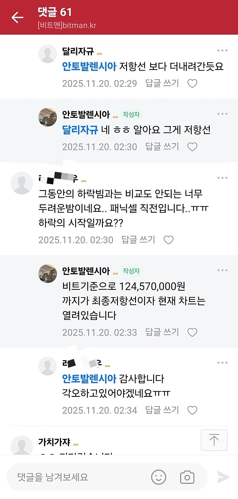 제가 말씀드렸던 1.24억선을 기준으로 1.21억정도 청산빔으로 빠졌다가 결국 1.24억 지지선에서 치열한 공방이 있었습니다