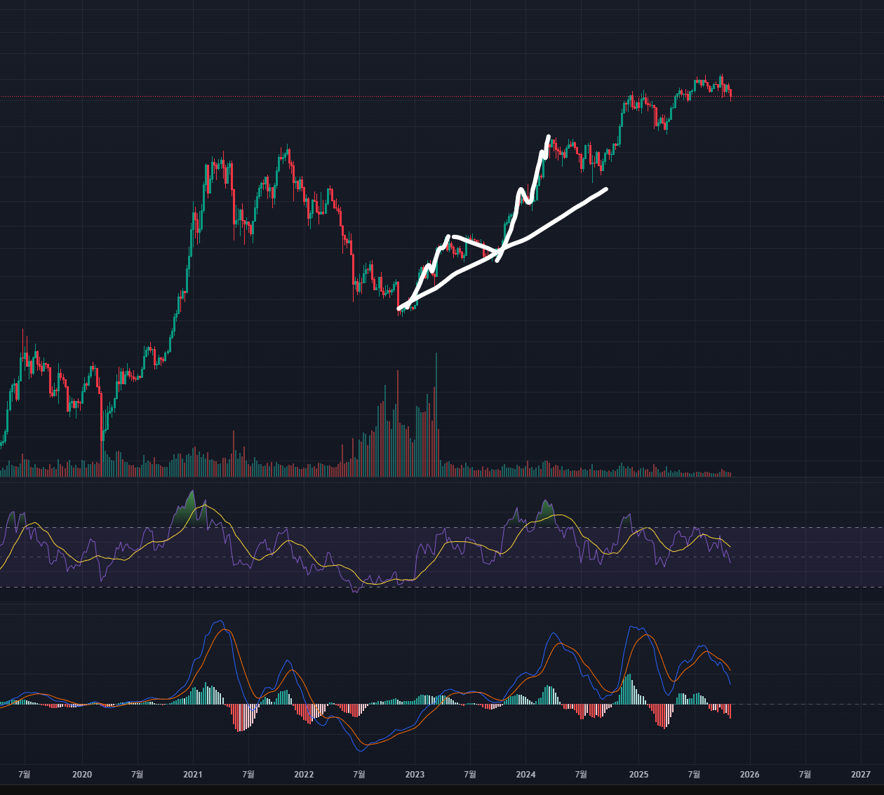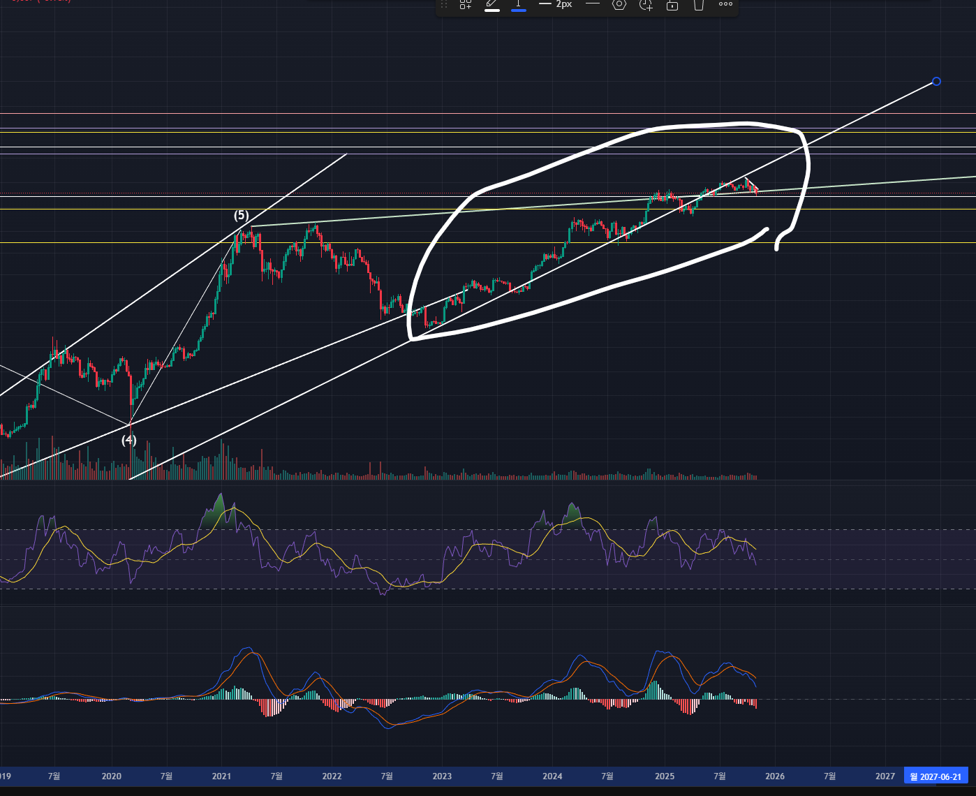 현재는 확실한 조정 파동의 모양새긴 한데 예전 관점과 지금 관점의 차이점은