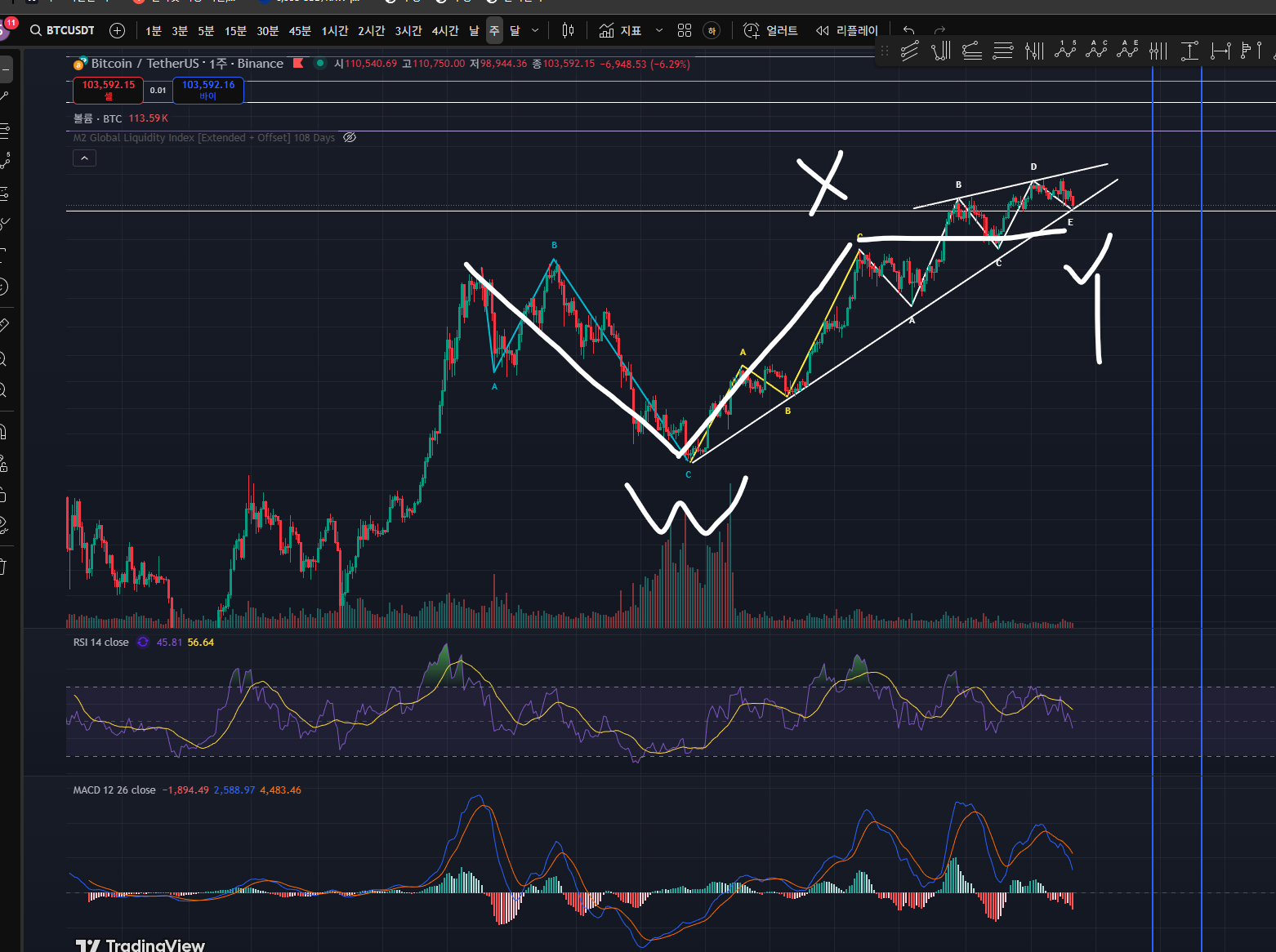 비트코인은 이렇게 전체 구조로 보고 결과적으로 비트코인은 조정파동이지만 현재 조정을 위로 주는 상황이고