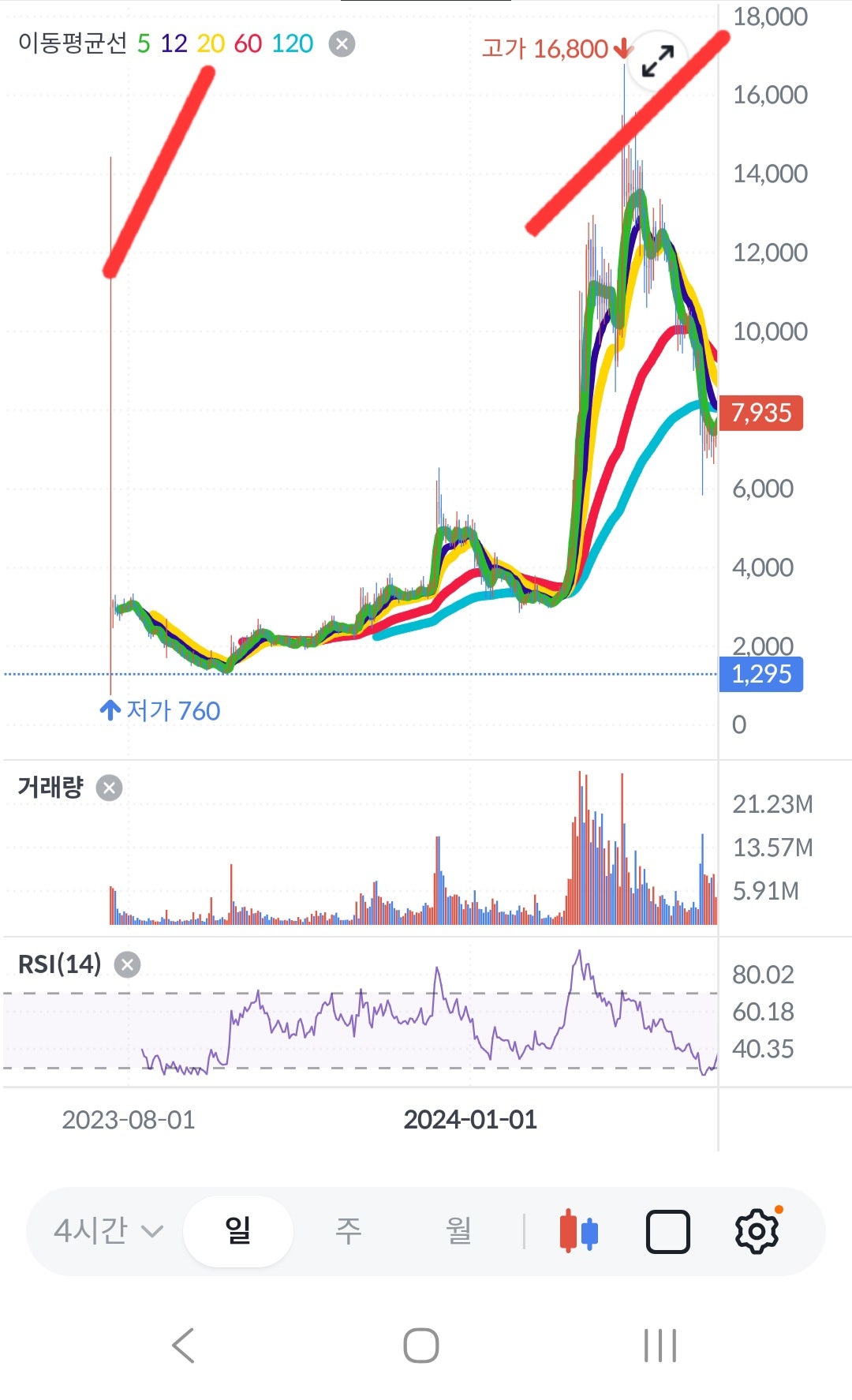 중요한 건 고점에서 “거래량”이 미친듯이 터지면서