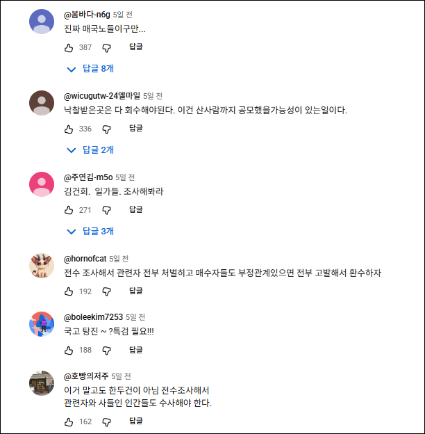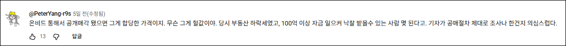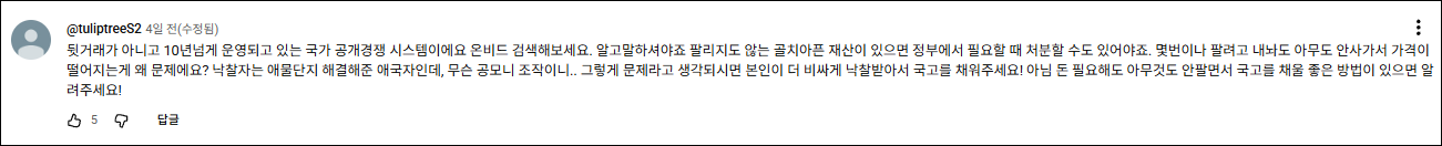 해당 동영상 댓글 대부분은 비판일색입니다. ‘다 회수해야 한다, 공무 가능성이 높다, 낙찰 받은 이도 공범이다’ 하는데, 싸게 사서 커미션을 주는 그런 모습을 상상하신 것 같습니다.