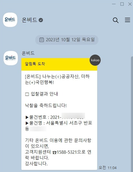 온비드에서 낙찰을 받으면 이렇게 낙찰알림 문자를 보내줍니다.