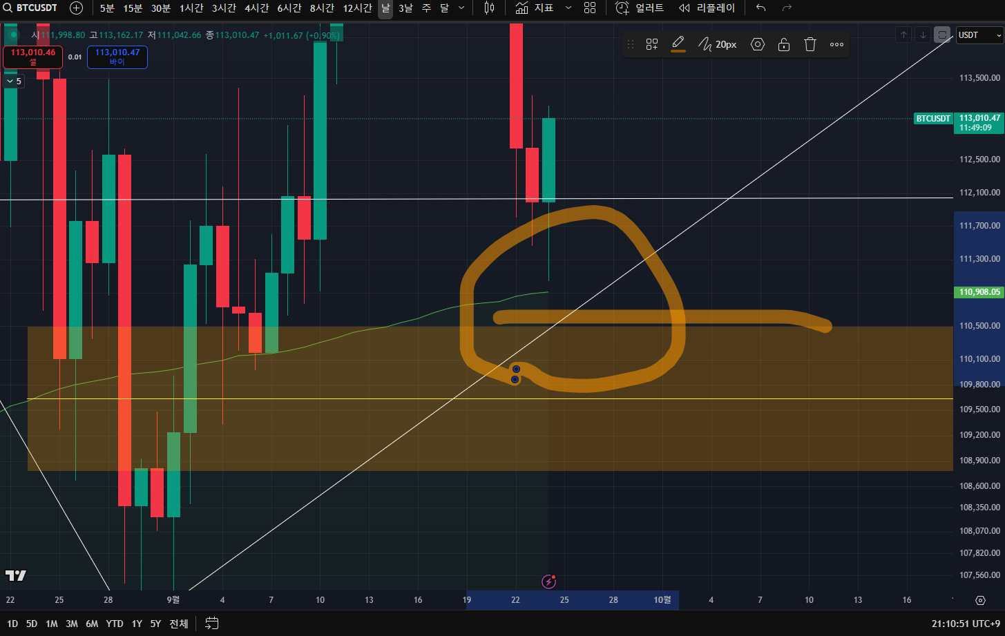그러나, 제가 체크해놓은 부근위, 111k까지만 찍고 올라가는 상황이 나왔고 저는 롱을 잡지 못했습니다, 그래서 지금 개인적으로 아쉬운 마음이 있지만…
