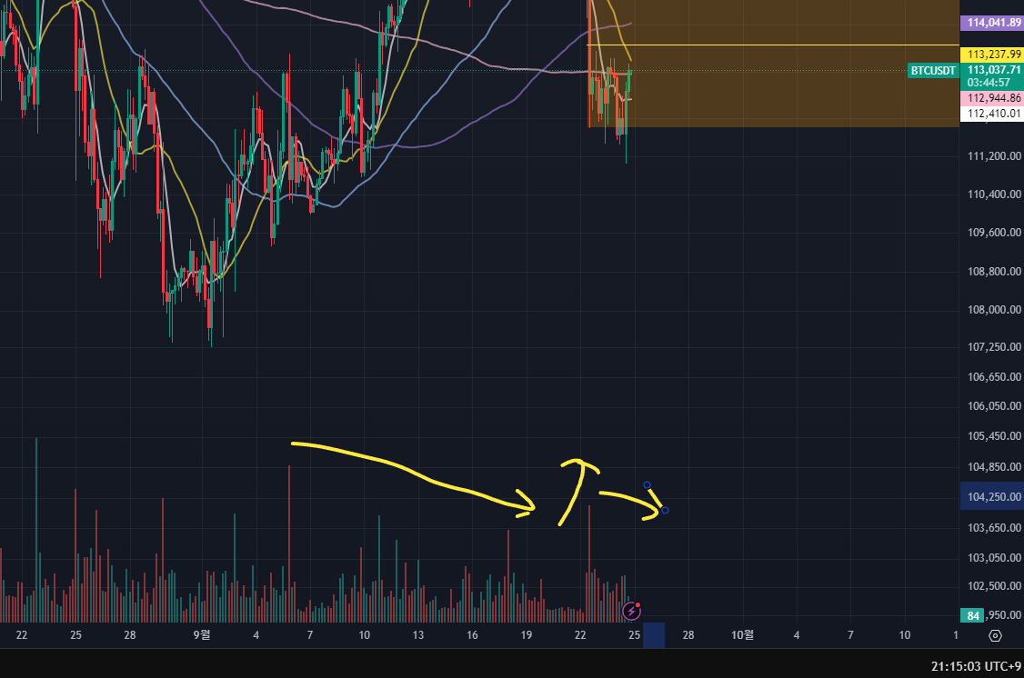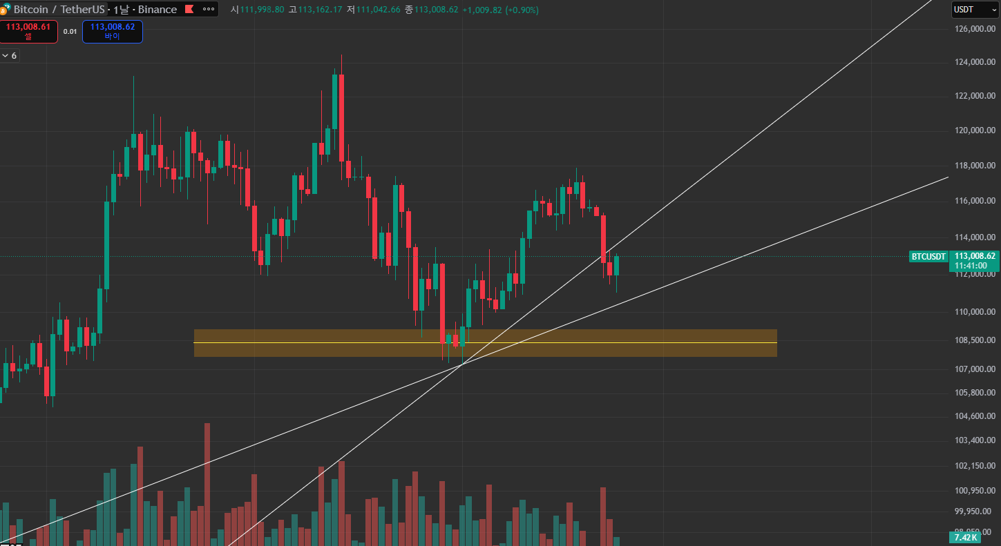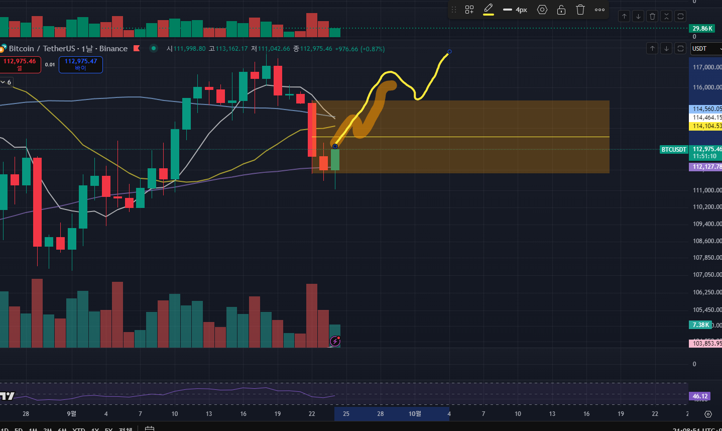 먼저, 비트코인 일봉부터 볼게요. 이런 분위기로 내일까지 봉 마감이 113.5k 위~114k위 마감을 해준다면 조금이나마 긍정적으로 볼 수 있는 확률이 생겼습니다.