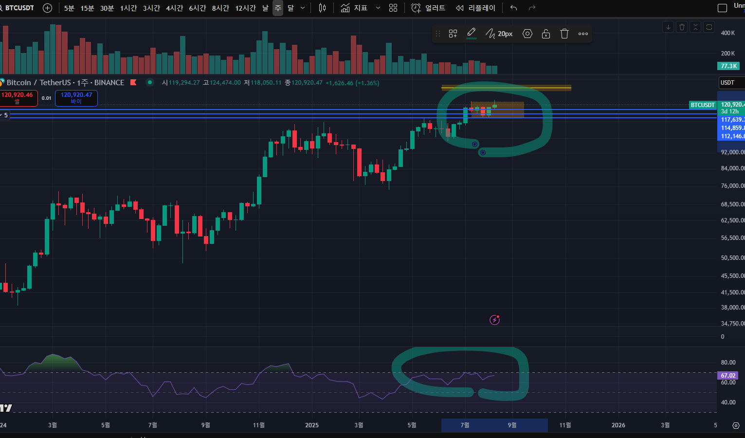 주봉 기준으로 여전히 rsi 밴드를 찢고올라오지 못한 상태이며