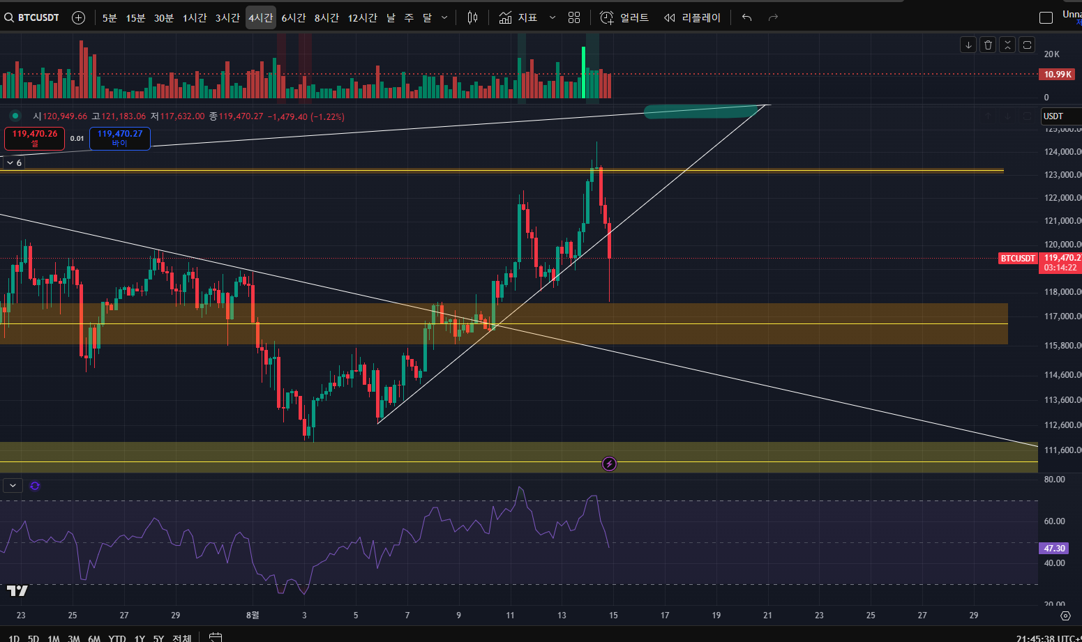오늘 124.5k에서 저항이 나오고 현재 120k까지 내려온 상태이며