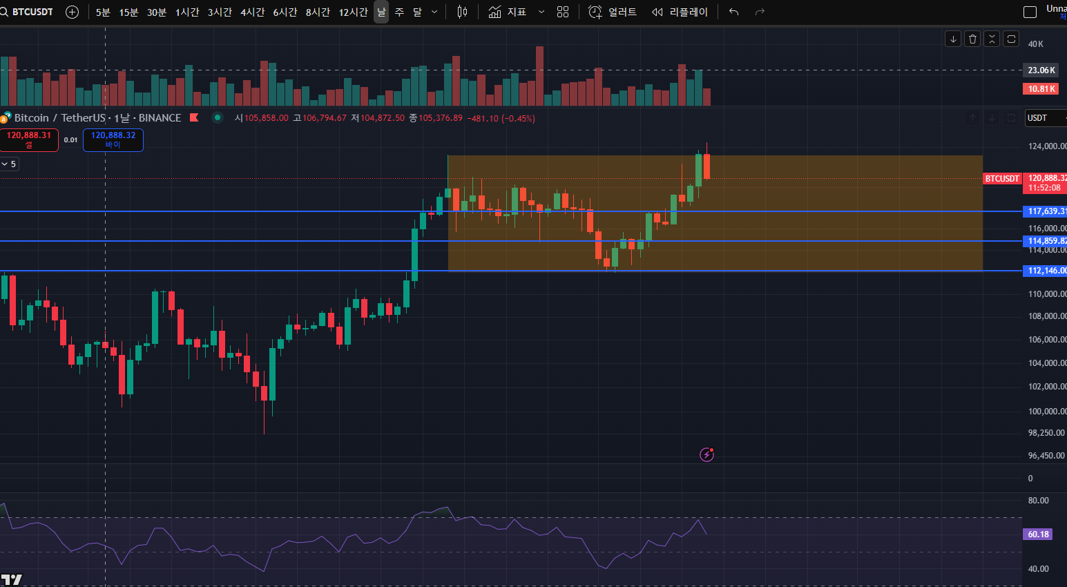 117K 건드렸으니 115, 112까지는 열어두는건 아직 유효하며 내려와주면 좋은 기회로 보고 저는 매수를 긍정적으로 생각할 예정입니다.